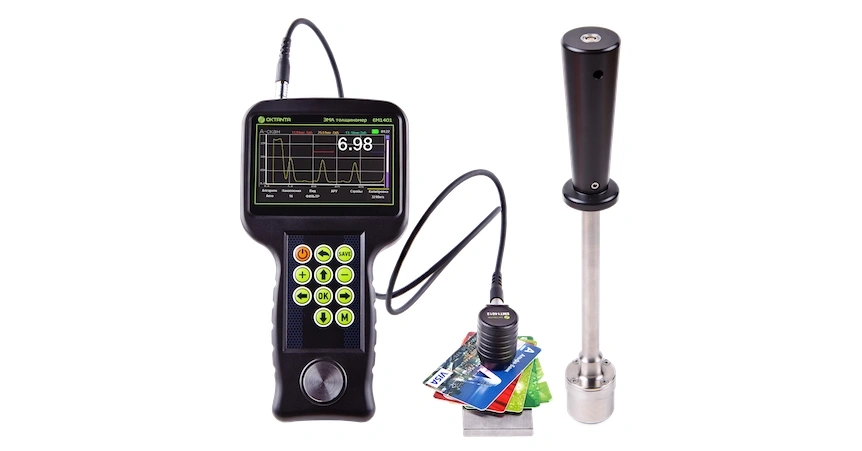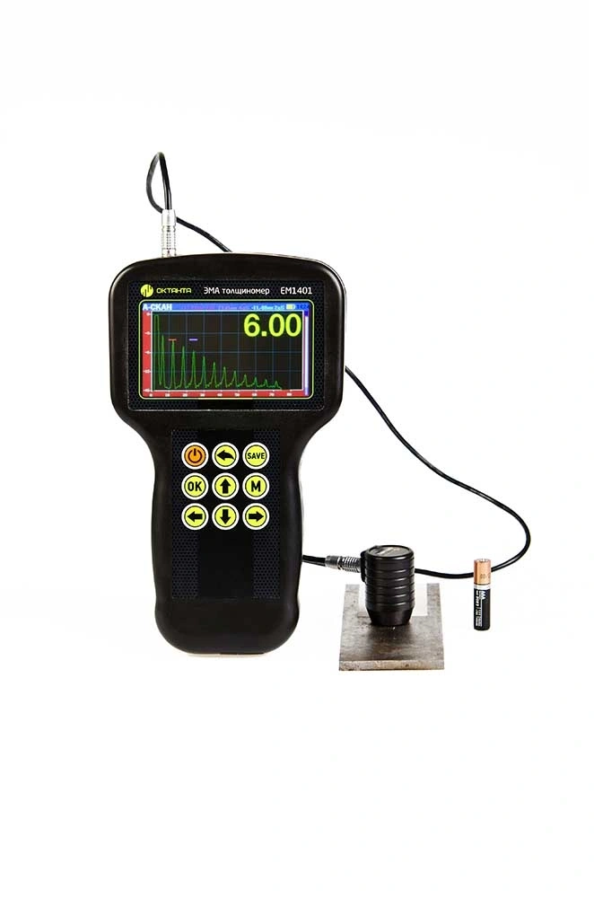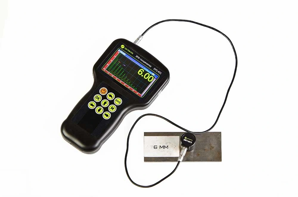Принцип действия данного прибора основан на распространении ультразвуковых волн в объекте и последующего анализа показателей их скорости для измерения толщины металла. К толщиномеру можно подключить ЭМА преобразователи.