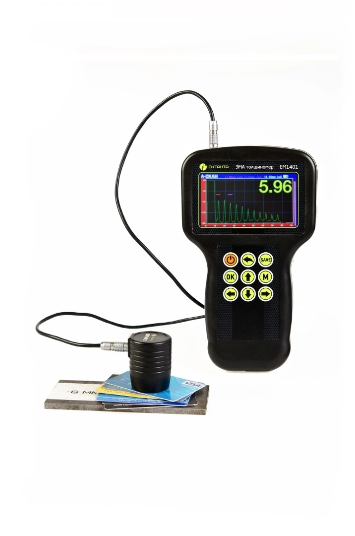 Ультразвуковой толщиномер EM1401 с помощью А-Скана дает пользователю возможность проводить анализ, визуализирует полученные показания на В-скане (в трех вариантах отображения), а также сохраняет полученные данные в матричной форме на С-скане.
