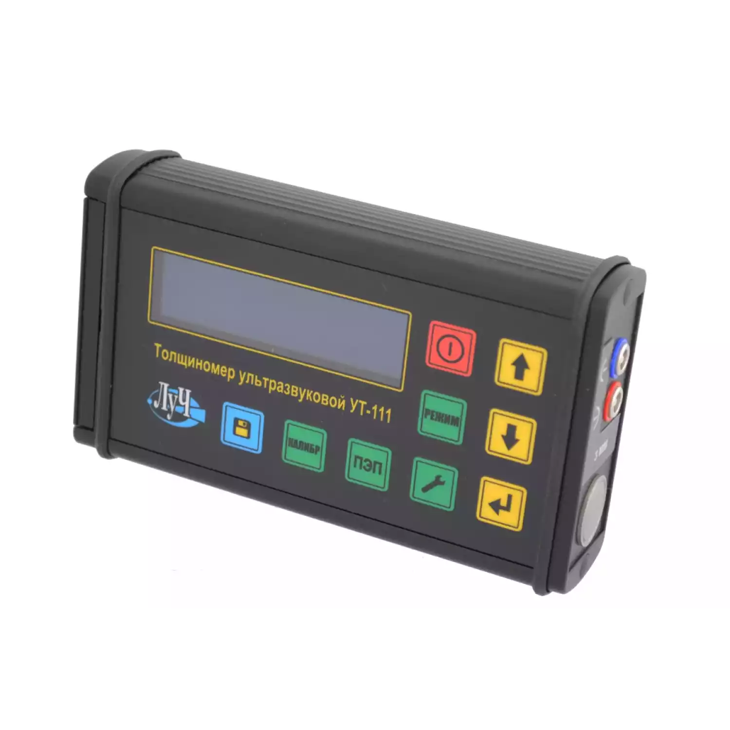 Толщиномер ультразвуковой УТ-111 общего назначения по ГОСТ 28702-90, предназначен для ручного контактного измерения толщины изделий из различных металлов и сплавов, стекла, керамики, полимерных и композиционных материалов, у которых коэффициент затухания ультразвуковых колебаний на частоте 5,0 МГц не превышает 0,3 дБ/см, со скоростями распространения продольных ультразвуковых колебаний (УЗК) от 100 до 9999 м/с при одностороннем доступе к объекту измерения.