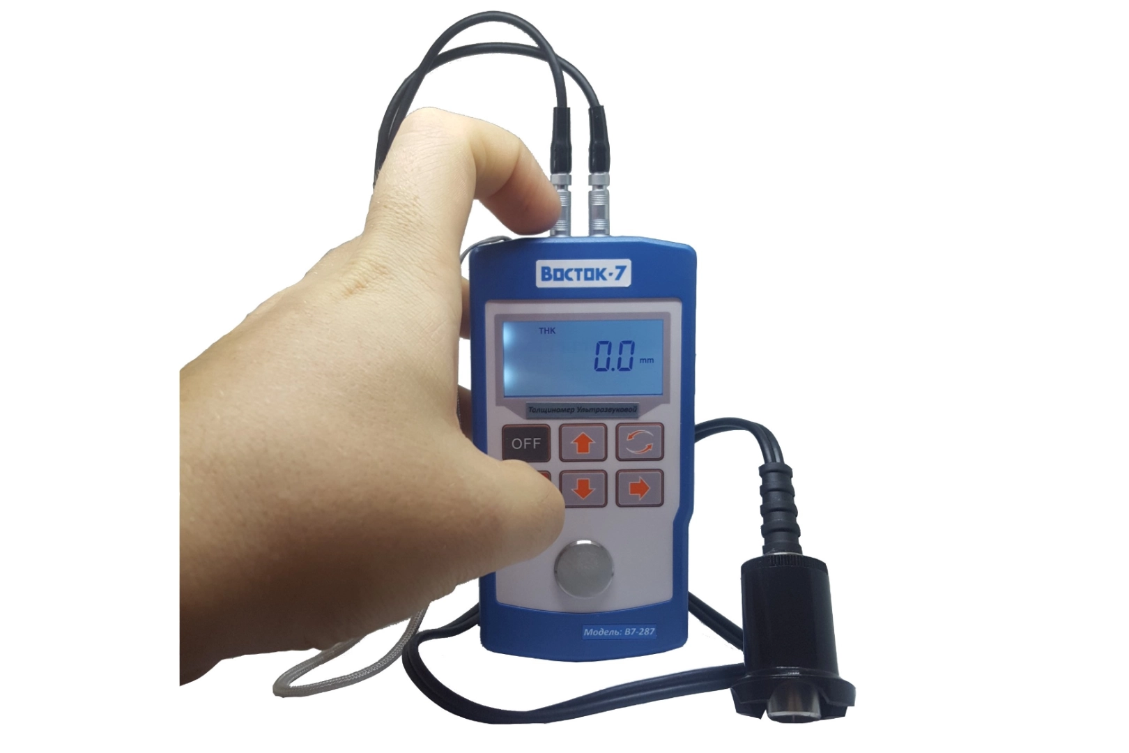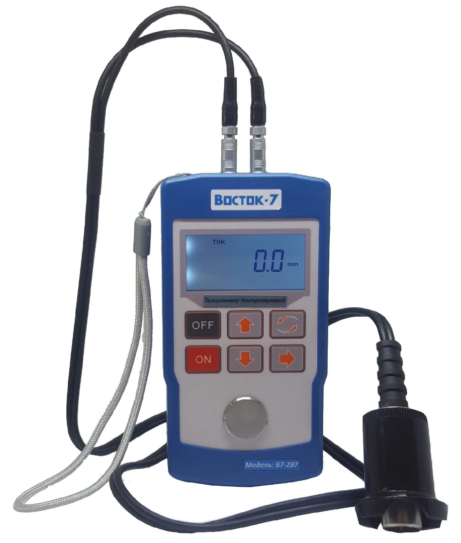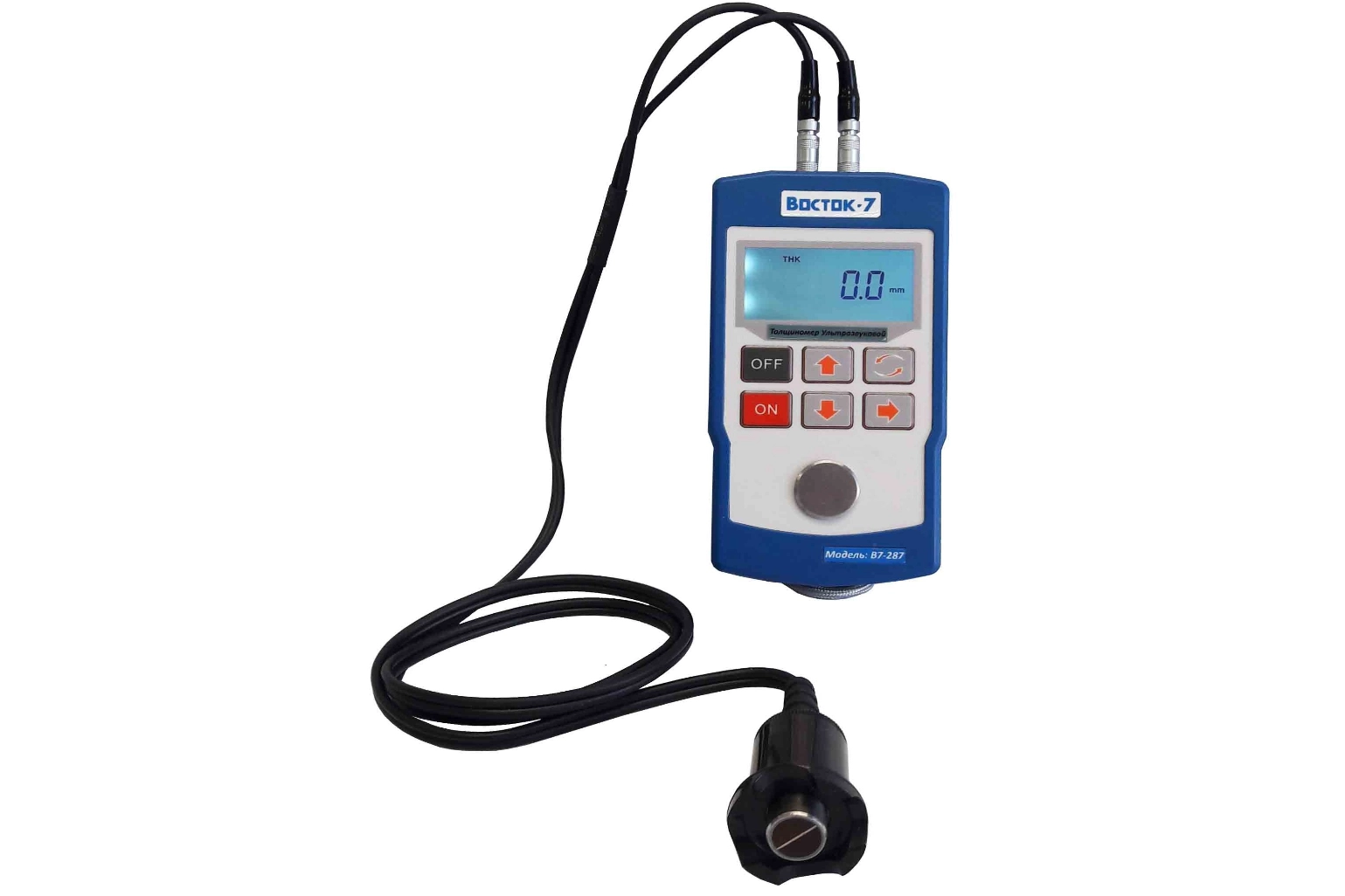 Толщиномеры ультразвуковые В7-287 измеряют толщины металлических и неметаллических изделий в диапазоне от 0,8 до 300 мм (по стали) с 5 различными типами преобразователей для стандартных (от -10 0С) и высокотемпературных (до 400 0С) поверхностей; низкочастотные преобразователи для толстых, сильно ослабляющих или сильно рассеивающих материалов, в т. ч. чугуна; миниатюрные преобразователи для измерения тонкостенных труб или труб с малой кривизной стенки. Базовый преобразователь РТ-5 с пружиной помещён внутрь каретки: каретка имеет боковые цилиндрические выемки для удобства измерения на прутках и тонких трубах, а встроенные пружины обеспечивают плотное прилегание преобразователя к криволинейной поверхности трубы или гиба с нормированным усилием, что даёт возможность контролировать изогнутые поверхности в широком диапазоне диаметров. Измерения скорости звука, память для сохранения результатов измерений отсутствует. Данная модель является наиболее простой в линейке ультразвуковых толщиномеров В7.