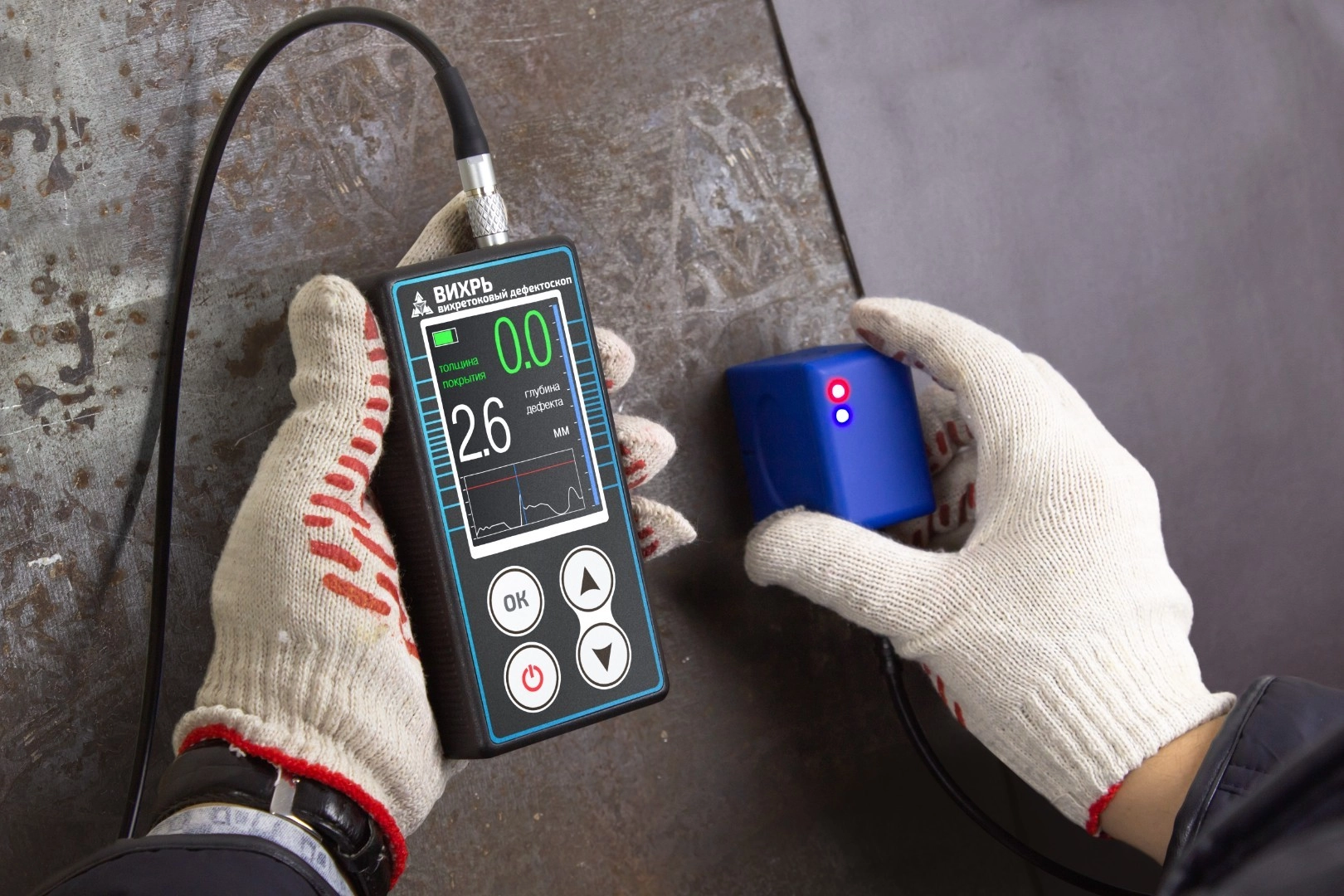 При сканировании материала дефектоскоп ВИХРЬ совмещает два метода: магнитный и вихретоковый. Благодаря этому можно контролировать конструкции с грубой и загрязненной поверхностью, а также вести измерения сквозь изолирующее покрытие или слой коррозии. Для исследования материалов с покрытием, имеющим переменную толщину, не требуется внесение дополнительных настроек.