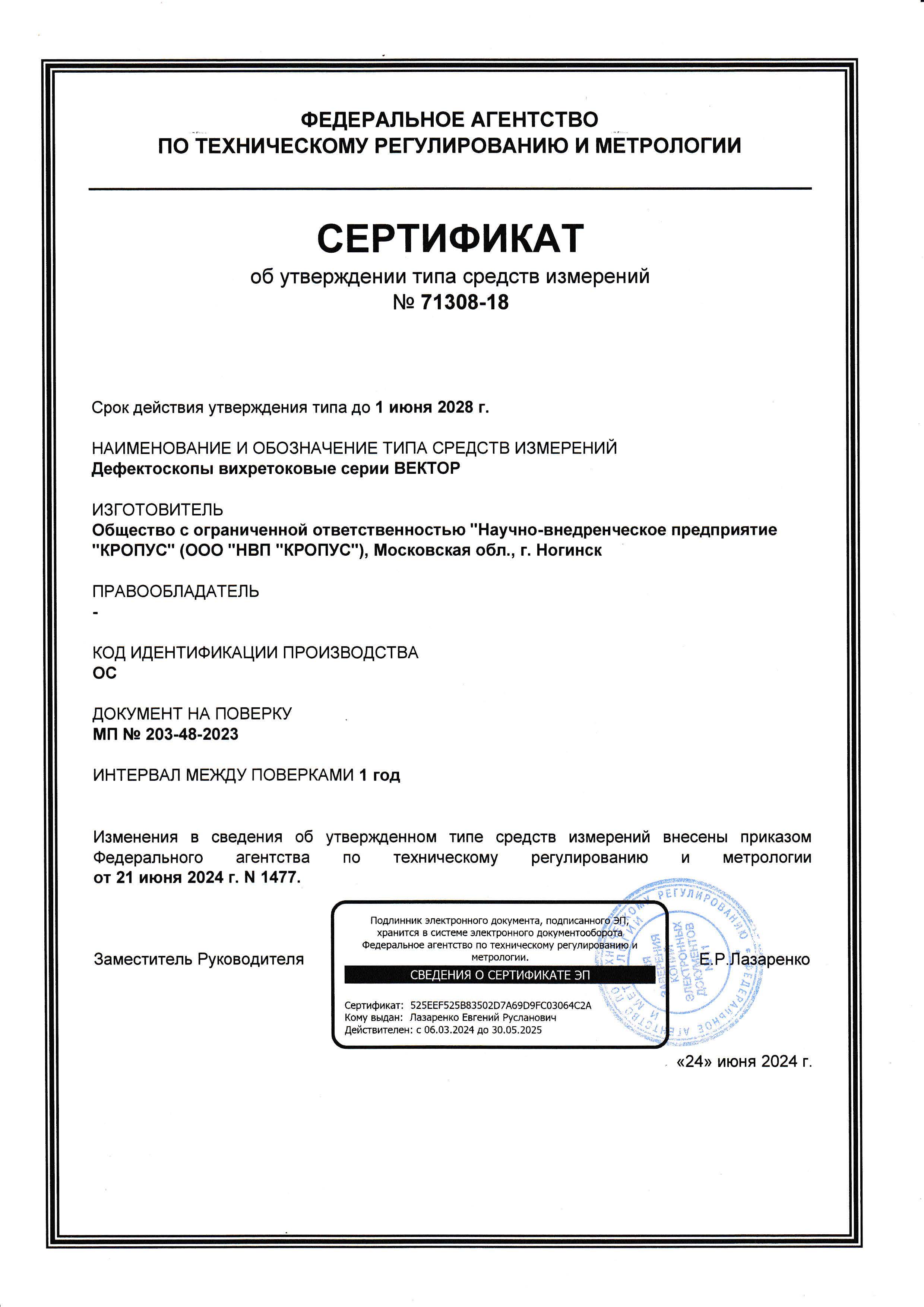 Вихретоковый дефектоскоп ВЕКТОР-40 сертифицирован Федеральным Агентством по Техническому Регулированию и Контролю и зарегистрирован в Государственном реестре средств измерений.