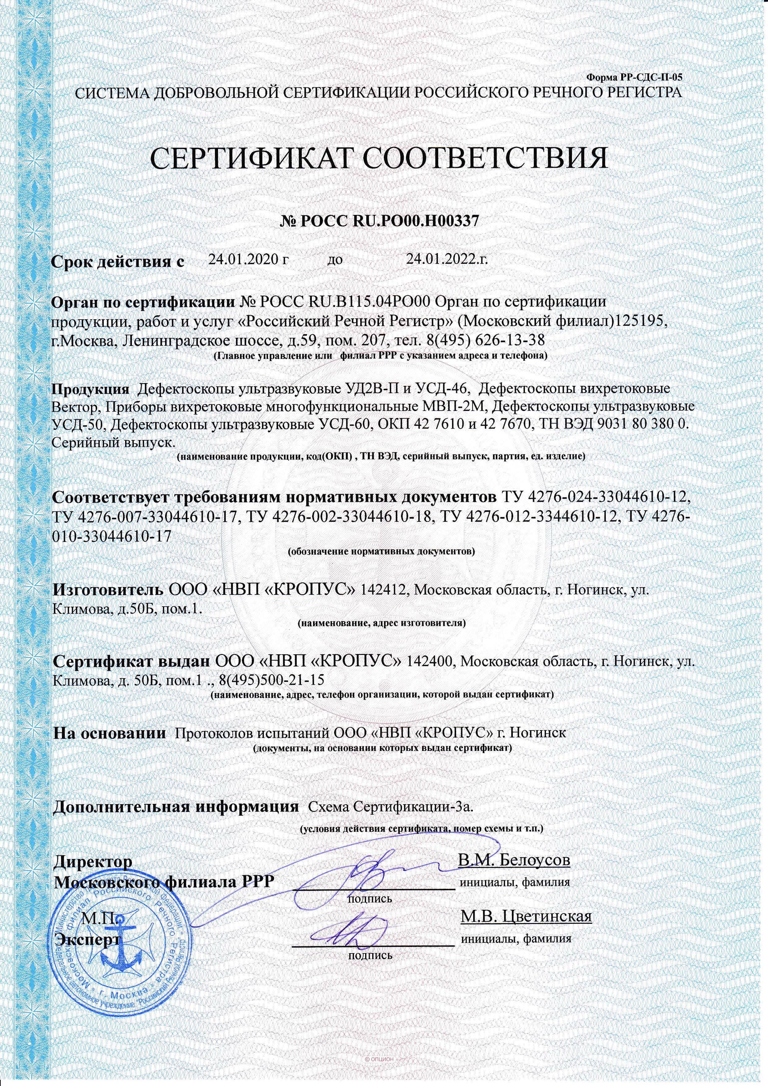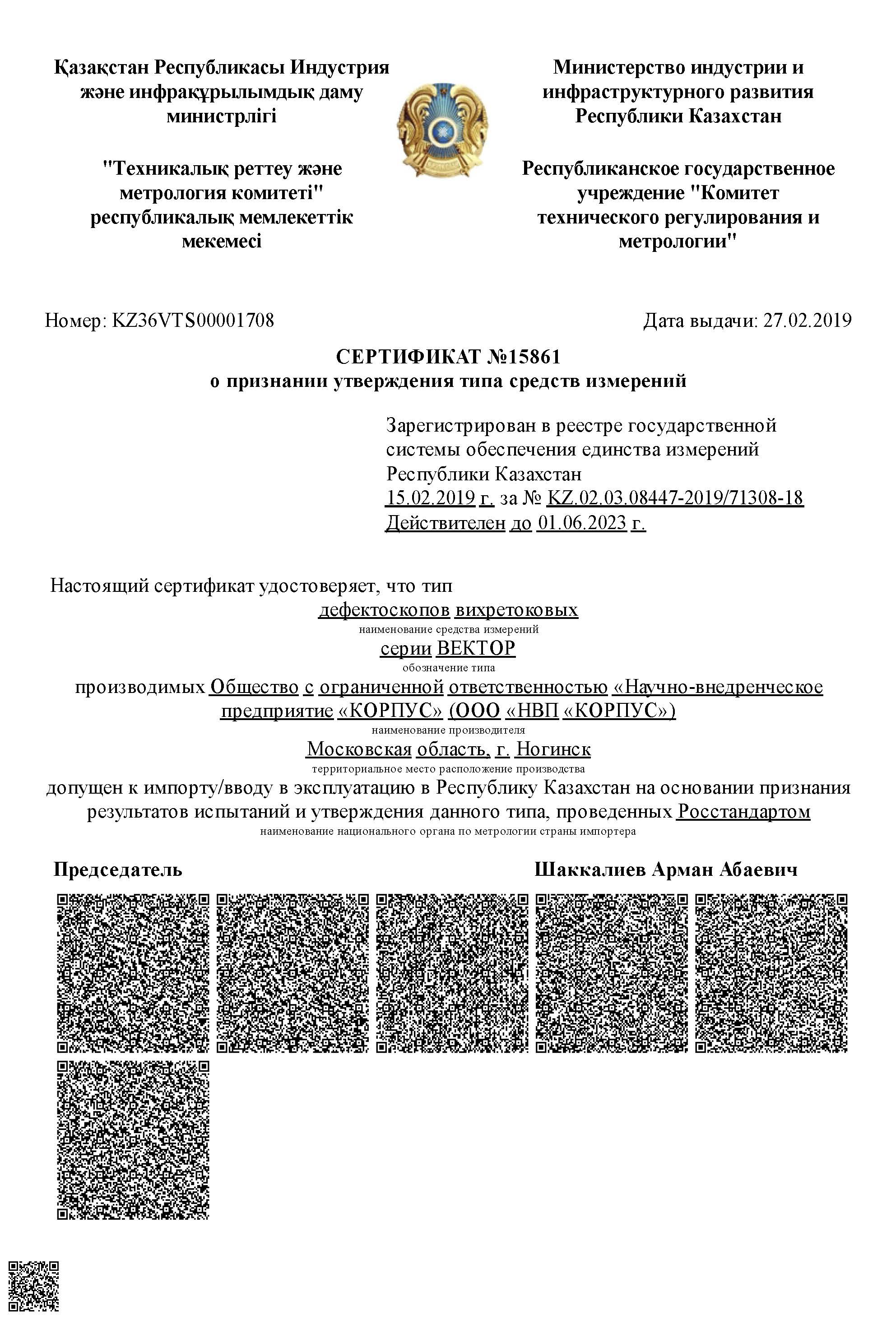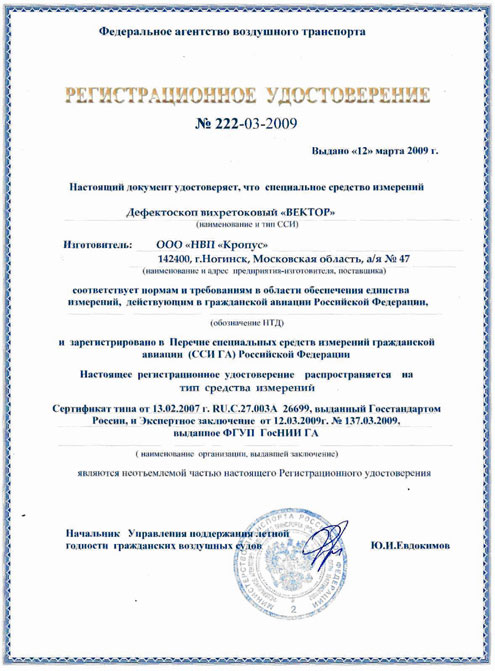 Вихретоковый дефектоскоп ВЕКТОР сертифицирован Федеральным Агентством по Техническому Регулированию и Контролю и зарегистрирован в Государственном реестре средств измерений.