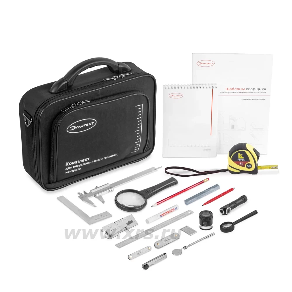 При визуальном осмотре применяются следующие инструменты из набора ВИК Элитест «Атомщик»: мощный фонарь, лупа просмотровая с подсветкой (3× и 8×), лупа просмотровая (7×), телескопическое зеркало. Допустимая шероховатость определяется по соответствующему образцу. На этапе измерительного контроля используются универсальный шаблон сварщика, штангенциркуль, металлическая линейка, набор щупов, угольник, набор радиусных шаблонов и рулетка. Для фиксирования результатов на объекте контроля используются термостойкий мелок и несмываемый маркер. Для записей результатов контроля в наборе предусмотрены авторучка, карандаш, блокнот и USB-флэш-накопитель (16 ГБ).