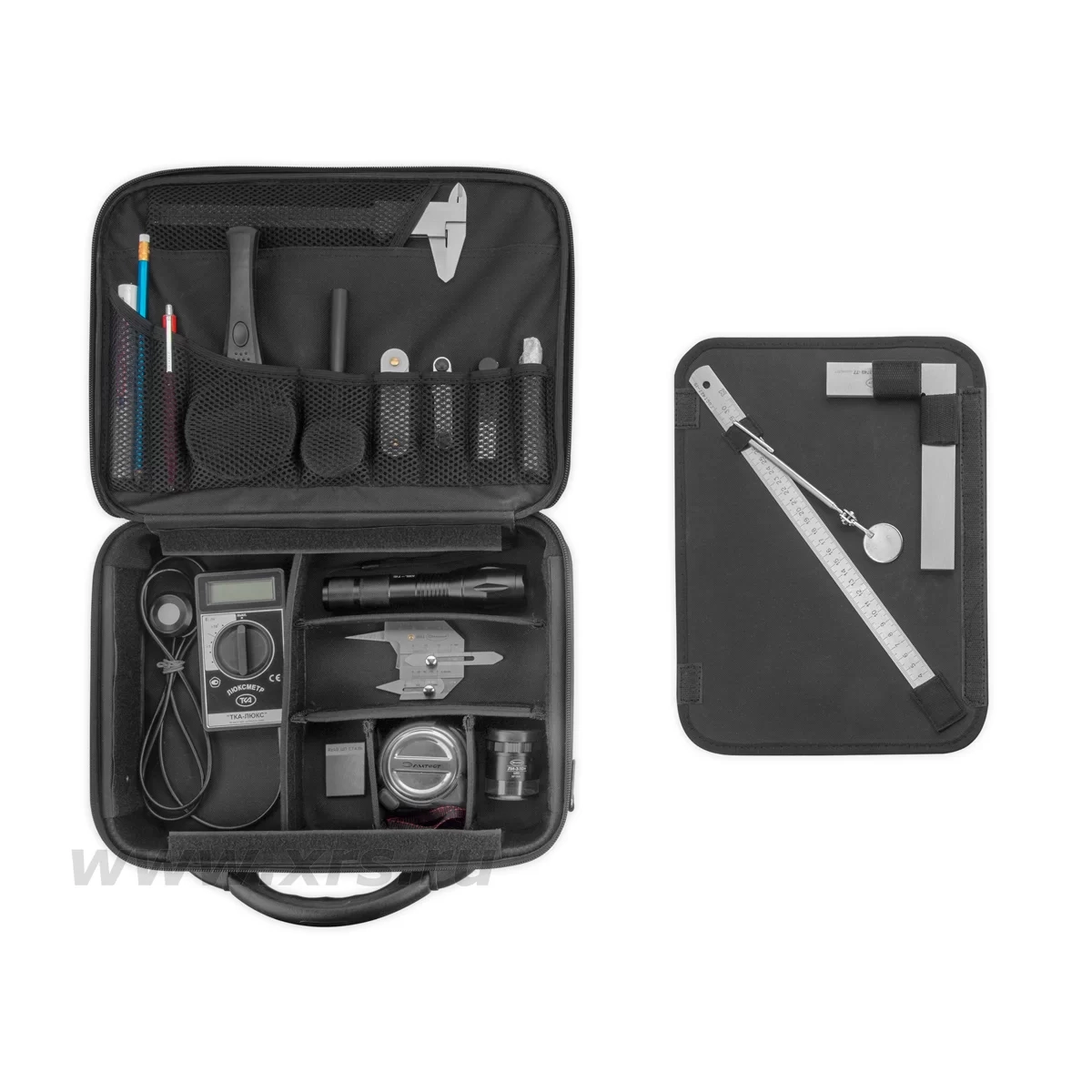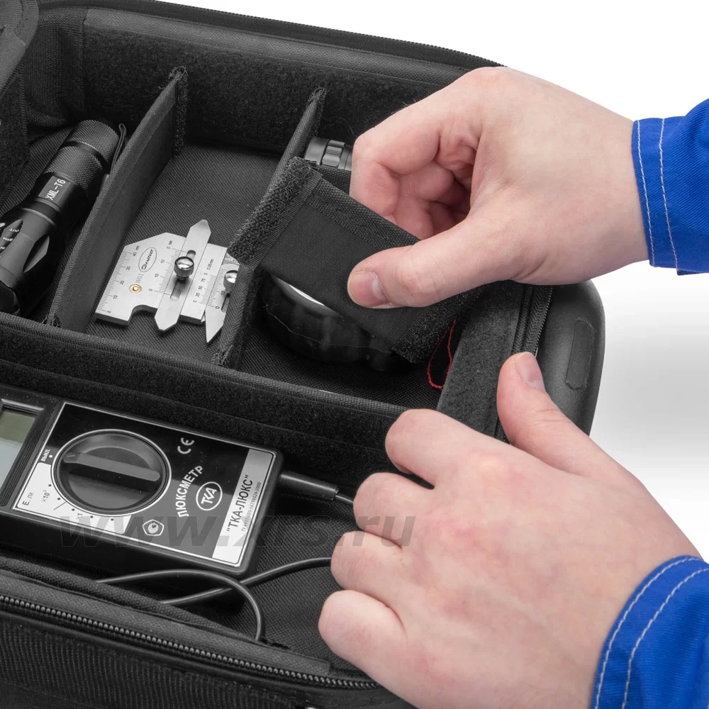 При визуальном осмотре контролируется наличие маркировки шва, клейма сварщика, присутствие недопустимых по РД-25.160.10-КТН-016-15 (п. 8.1.10.4) дефектов и наличие зачистки поверхности сварных соединений для проведения других методов НК. На этапе исправления дефектов инструменты набора позволят контролировать ширину зоны зачистки и наличие мест шлифовки околошовной зоны. Для проведения осмотра в комплекте предусмотрены мощный фонарь, две просмотровые лупы и телескопическое зеркало.