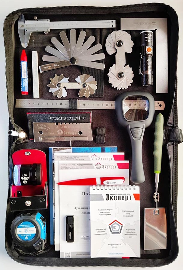 Комплект ВИК «Поверенный» предназначен для измерений относящихся к сфере государственного регулирования ОЕИ (ФНП по НК и 102-ФЗ). Весь измерительный инструмент поверенного набора внесен в Государственный реестр средств измерения РФ и имеет отдельное свидетельство о поверке. Поверенный набор изготовлен по ТУ 26.51.66-001-61670358-2023 и укомплектован измерительным инструментом в соответствии с рекомендациями РБ «Методические рекомендации о порядке проведения визуального и измерительного контроля», приказ РТН №8 от 16.01.2024 г. Поставляется со свидетельством о поверке собственной метрологической службы и флешкой, содержащей образцы техкарт, актов и журналов ВИК, учебники по визуальному контролю и сварке, а так же нормативные акты по данной теме.
