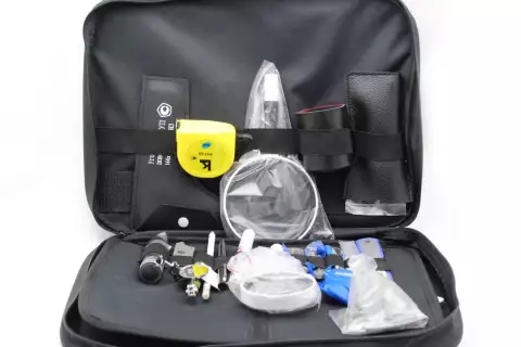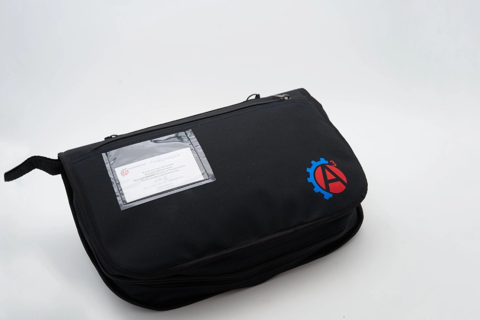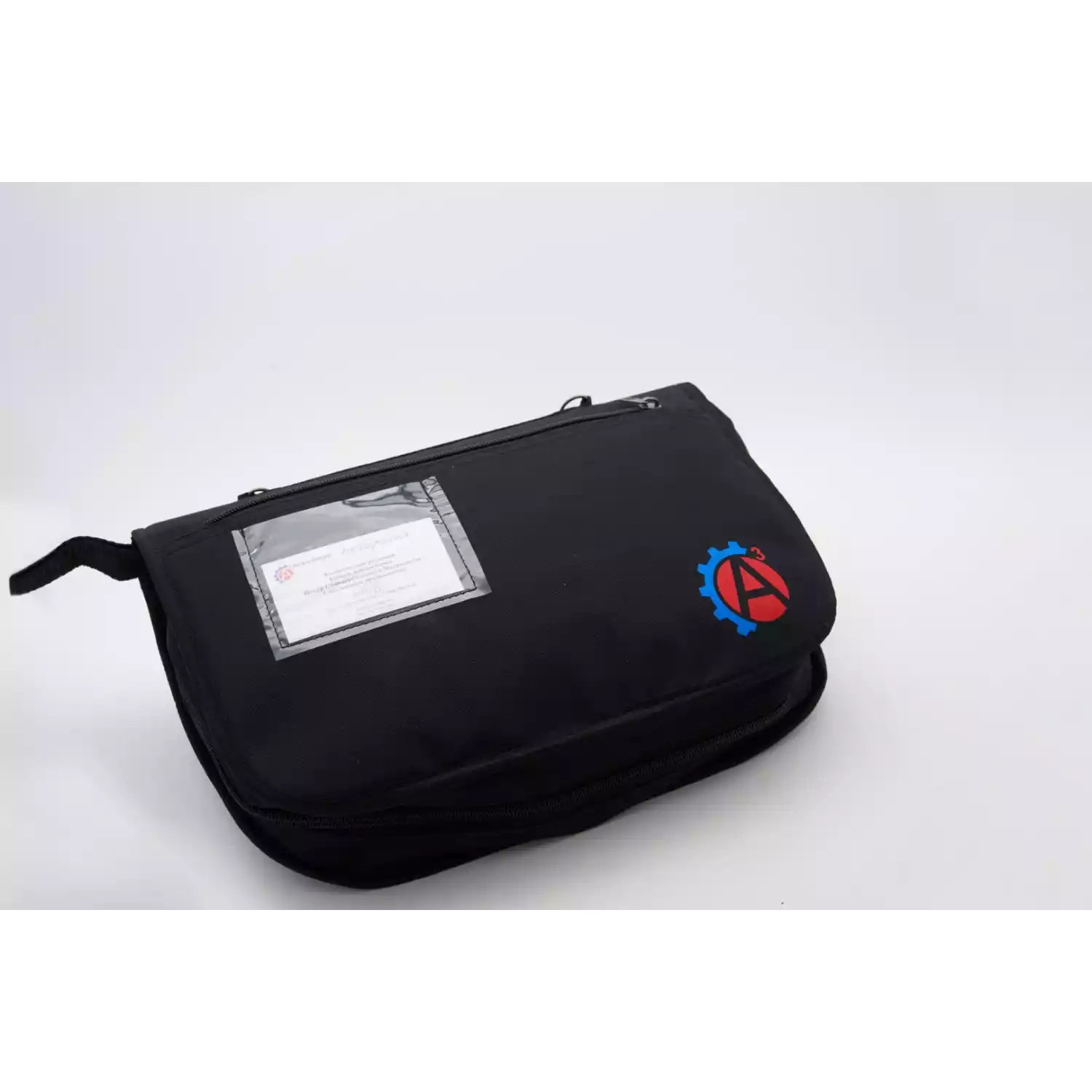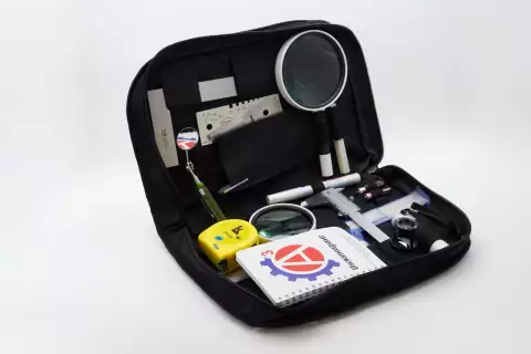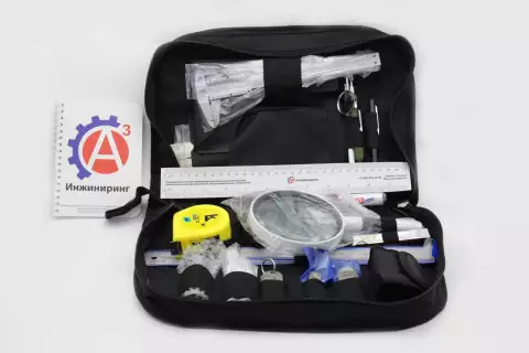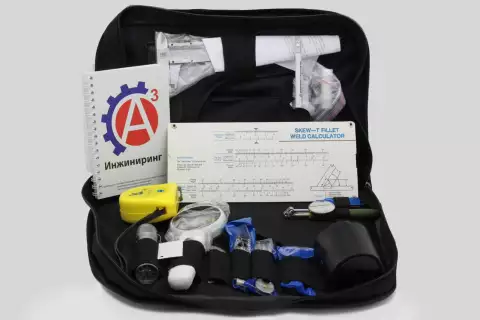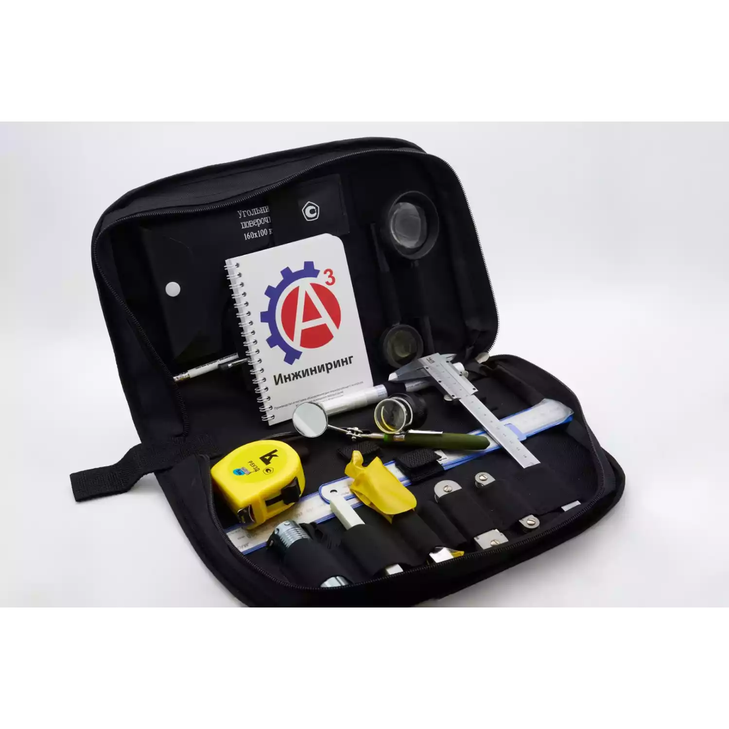 В комплект входит измерительный инструмент: штангенциркуль, универсальный набор сварщика, угольник поверочный, линейка, набор щупов, радиусные шаблоны и т. д. Кроме того, присутствуют лупы с разной кратностью увеличения, фонарик с батарейками, мелок сварщика, зеркало, блокнот, карандаш и ручка для записей. Набор упакован в удобную для переноски влагостойкую сумку-папку.