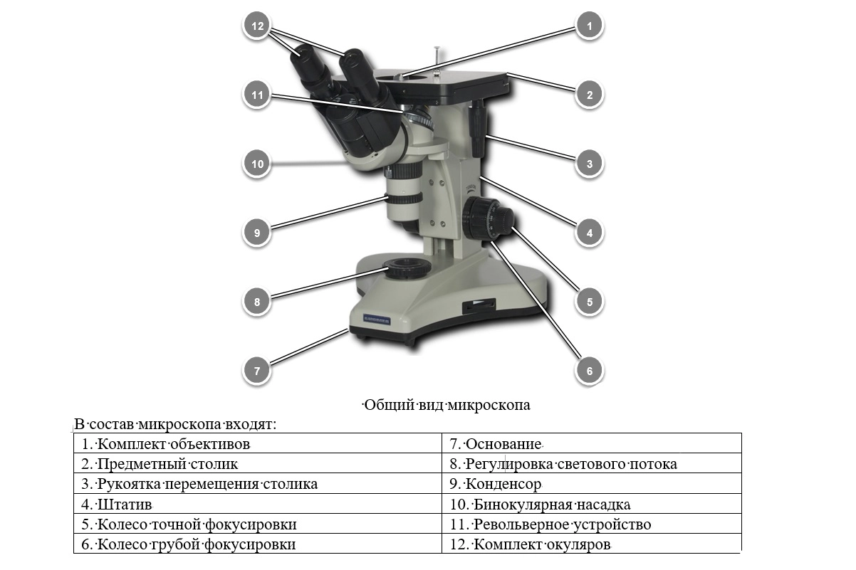 · галогенная лампа 20 Вт, 6 В; · плавная регулировка яркости освещения; · планка со светофильтрами (синий, зелёный, жёлтый, матовый). |