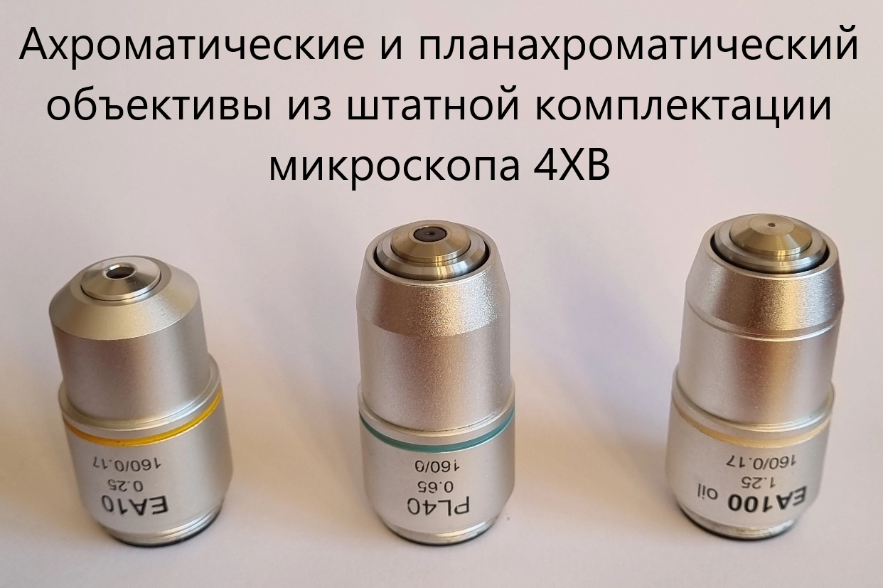· ЕА10Х/0,25 160/0,17 ахроматический объектив, рабочее расстояние 7 мм, фокальное расстояние 17,13 мм, покровное стекло d=17; резьба RMS 20,23 мм; · PL40X/0,65 160/0 планахроматический объектив, подпружиненный, рабочее расстояние 0,0,714 мм, фокальное расстояние 4,328 мм, без покровного стекла d=0; резьба RMS 20,23 мм; · ЕА100Х/0,25 oil 160/0,17 ахроматический объектив, подпружиненный (МИ - масляная иммерсия), рабочее расстояние 0,198 мм, фокальное расстояние 2,906 мм, покровное стекло d=17; резьба RMS 20,23 мм |