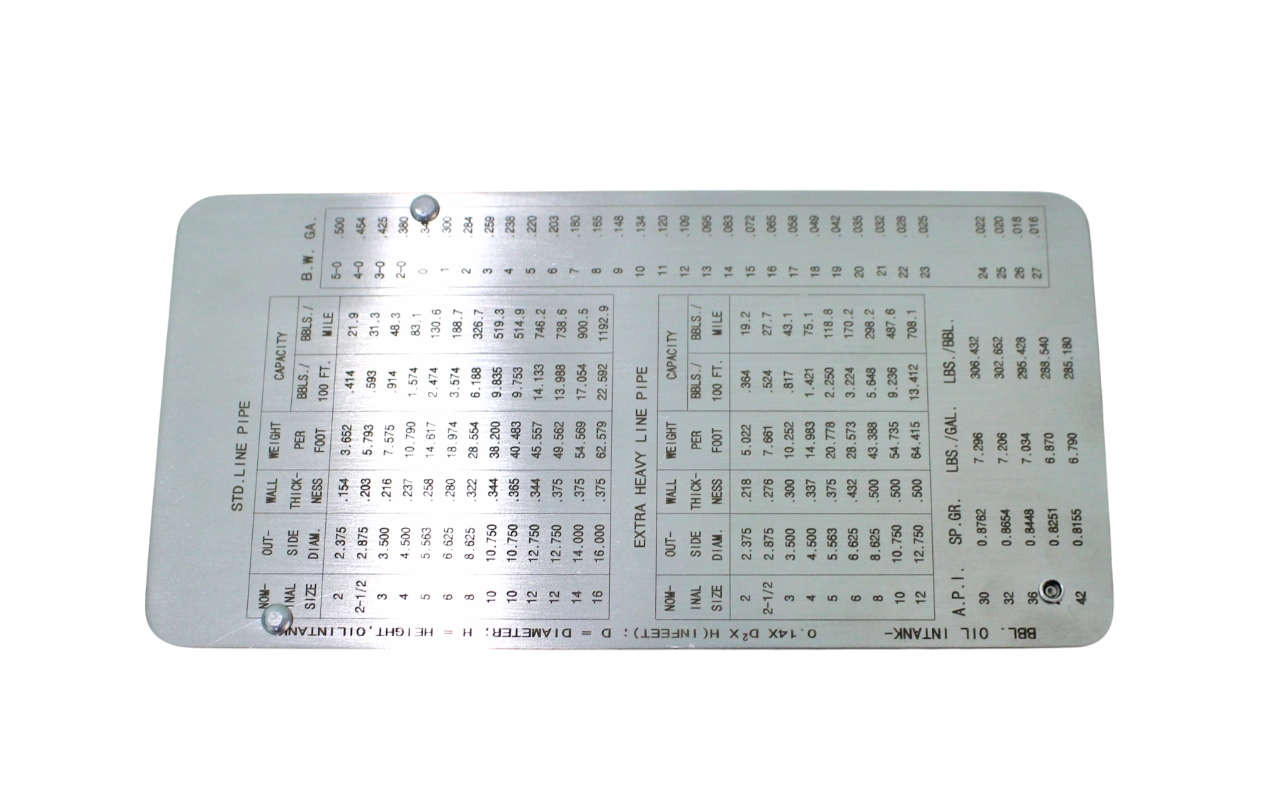 Шаблон WG10 предназначен для визуально-измерительного контроля трубопроводов. Шкалы шаблона обозначаются в дюймах. На шаблон нанесены формулы расчета геометрических и физических величин. На обороте содержатся таблицы с типовыми сочетаниями диаметра, толщины, массы и емкости трубопроводов.