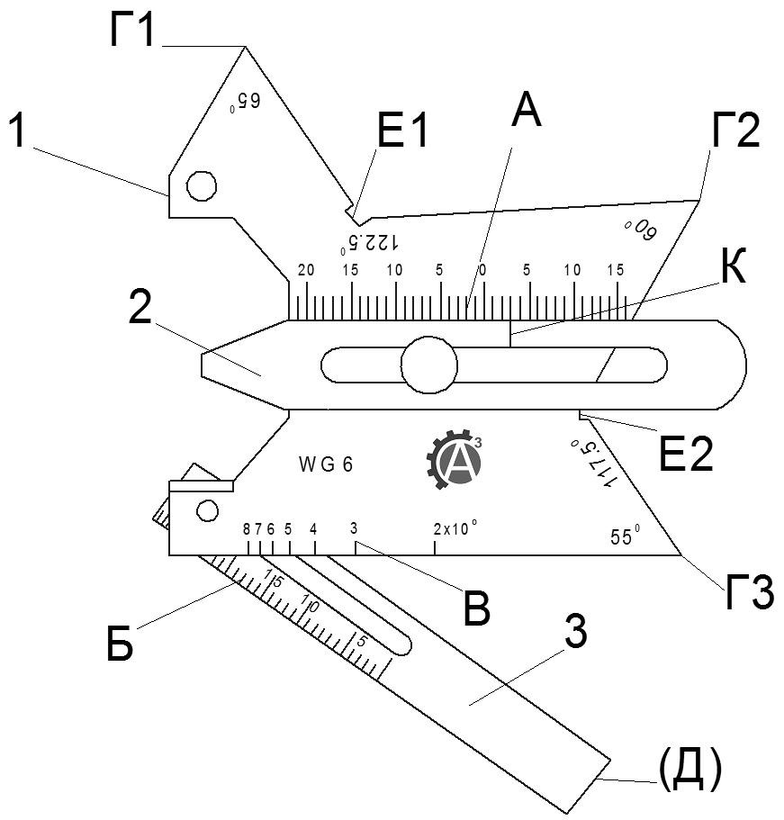 1 – основание; 2, 3 – измерительные движки; А, Б, В, Д (с обратной стороны движка 3) измерительные шкалы; К – контрольная риска-индекс шкалы (А); Г1-3, Е1-2 – контрольные углы