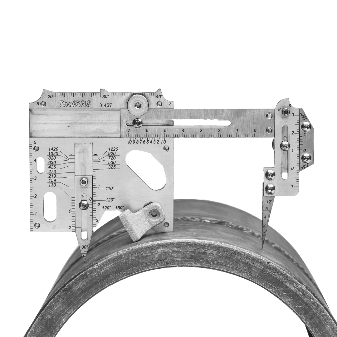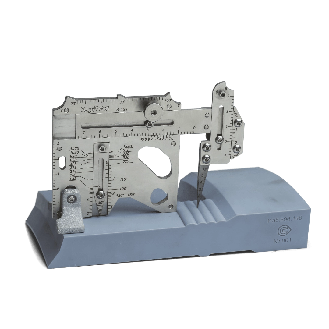 УШС “Тапирус” оснащен опорами, позволяющими однозначно позиционировать шаблон на криволинейной поверхности. Для проведения измерений с погрешностью 0,1 мм на поверхность TapiRUS нанесены шкалы с нониусом. Содержит ряд калибров для оценки плавности перехода от наплавленного к основному металлу, величины катетов, радиусов и углов разделки кромок. Универсальный шаблон специалиста “Тапирус” снабжён щупом со сменной измерительной иглой для определения величины зазоров и высот/впадин.