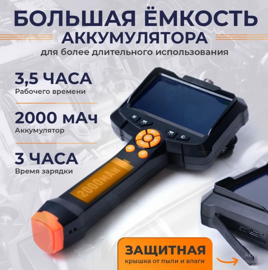 Аккумулятор эндоскопа емкостью 2000 мАч может работать в течение 3,5 часов без подзарядки, что важно при длительных проверках и ремонте.