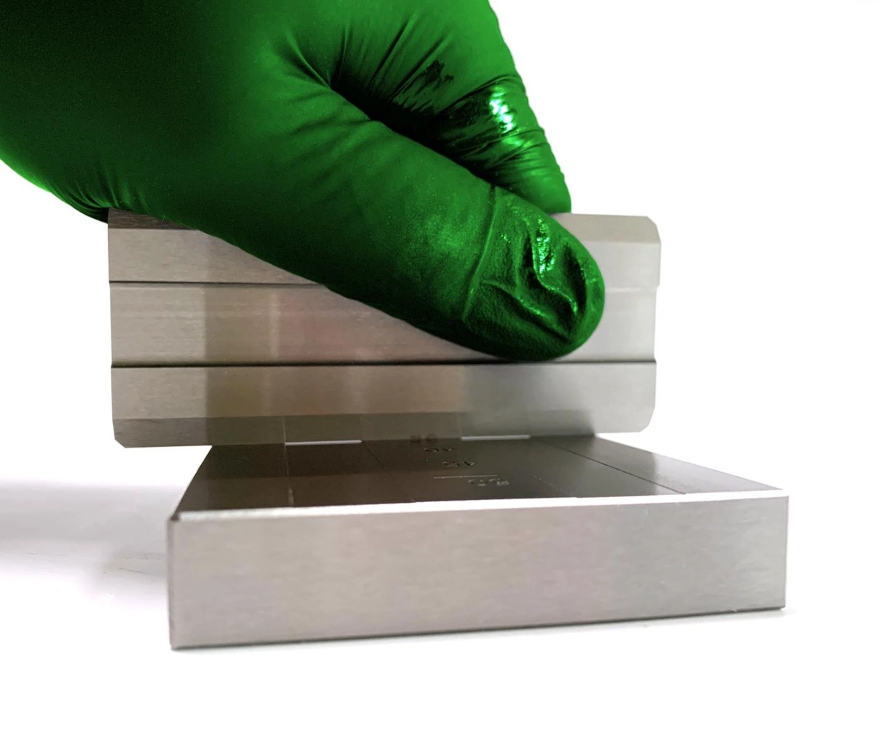 Прибор состоит из измерительной плиты и скребка выполненных из закаленной нержавеющей стали. На верхней отполированной части измерительной плиты расположены два одинаковых клинообразных паза с равномерно увеличивающейся глубиной от 0 до 150 мкм, что позволяет проводить параллельное испытание материала. Шкала с обозначение глубины паза наносится на верхнюю или боковую грань прибора методом гравировки. Простая конструкция гриндометра ПРОМТ ГК-2 не требует специальных навыков для работы с ним и идеально подходит для оперативного контроля степени перетира как в лабораторных, так и в цеховых условиях.