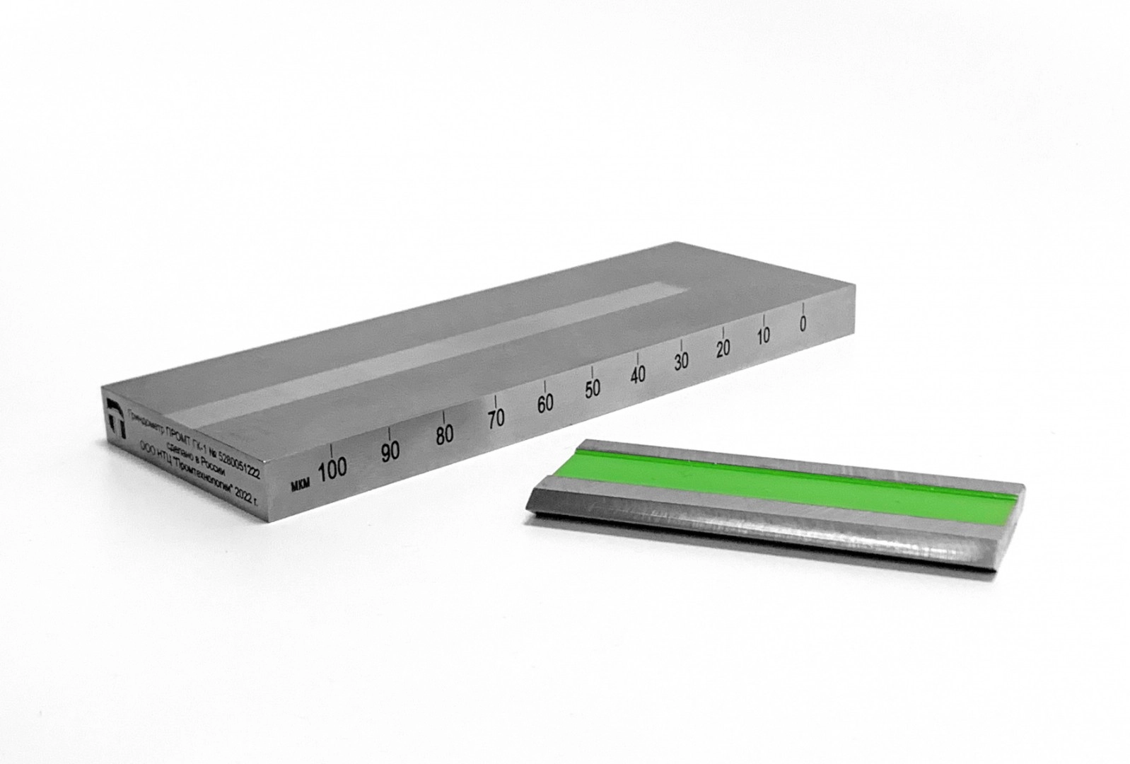 Гриндометр ПРОМТ ГК-1 (0-100 мкм) используется для контроля степени перетира пигментированных лакокрасочных материалов, диспергированных пигментов и наполнителей по ГОСТ 31973-2013, ISO 1524. В основу метода положено распределение испытываемого материала в клинообразном пазе прибора специальным скребком. Результатом измерения является значение глубины паза в мкм на котором будет визуальным способом зафиксировано появление штрихов или видимых частиц материала. Температура является важным параметром при проведении испытания и определяется ГОСТ либо нормативными документами на контролируемую жидкость. Представляет из себя модифицированную версию гриндометра NOVOTEST ГК-1.