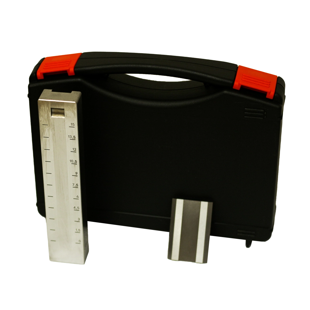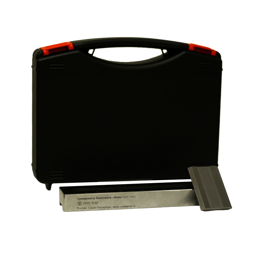 Прибор состоит из стальной измерительной плиты и скребка. На измерительной поверхности плиты вдоль нее выполнен клинообразный паз с равномерно увеличивающейся глубиной от «0» до максимального предела измерения прибора. По краям паза нанесена цифровая шкала. Глубина паза соответствует шкале прибора.