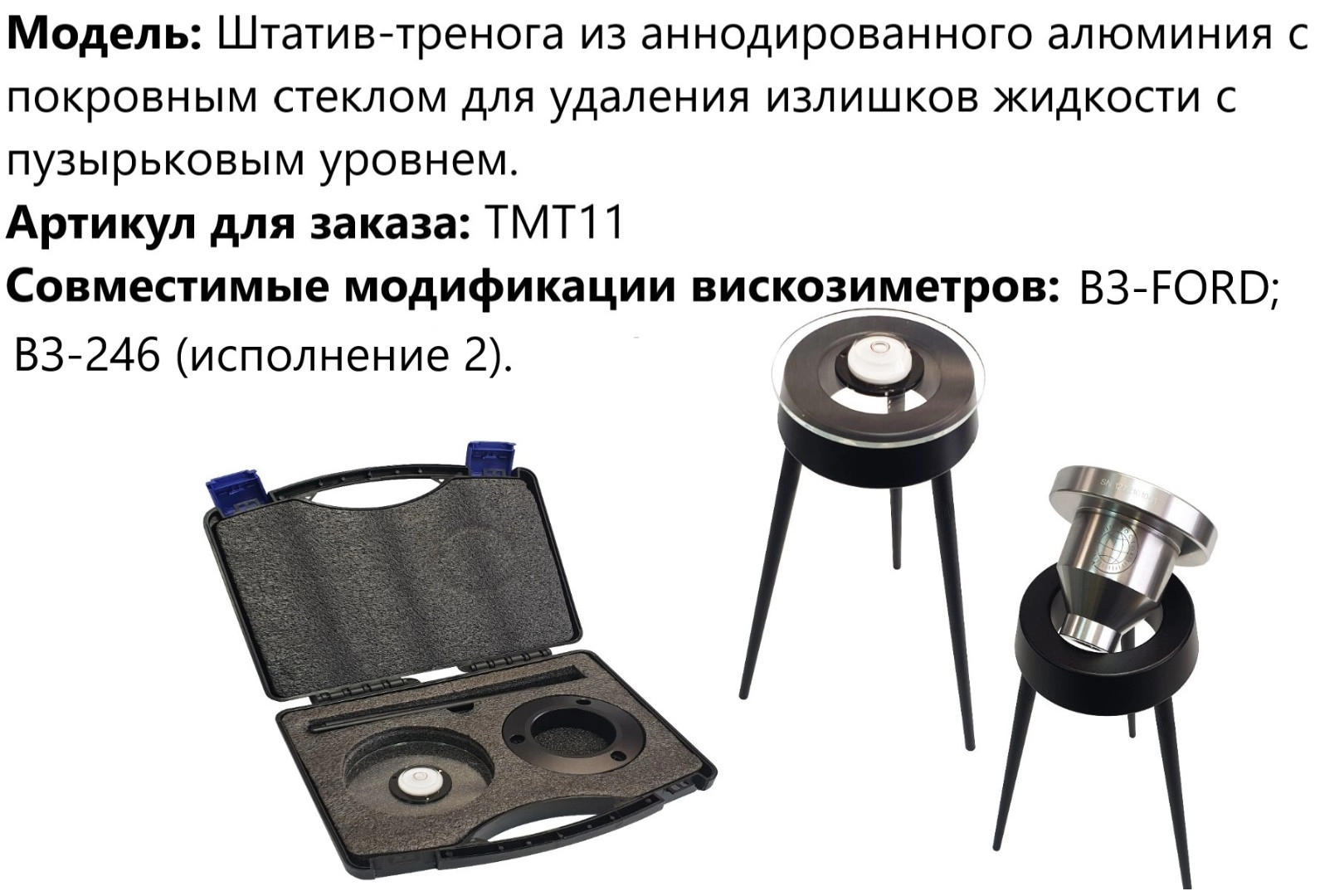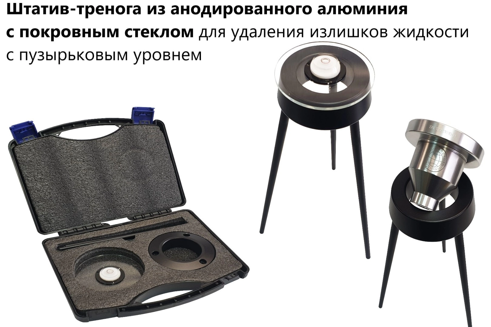Штатив-тренога из анодированного алюминия с покровным стеклом для удаления излишков жидкости с пузырьковым уровнем.