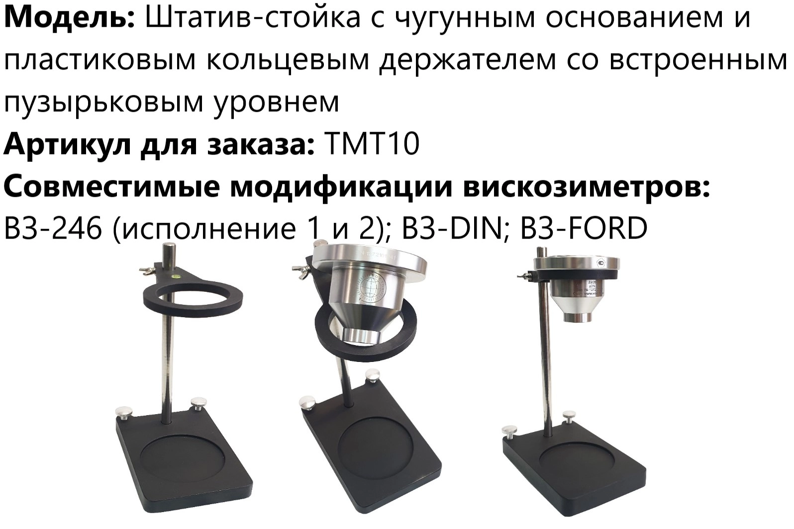 Следует соблюдать меры предосторожности при тестировании тиксотропных и прочих неньютоновских жидкостей на вязкость в связи с отсутствием определённой скорости сдвига в воронке.| Изображение | Модели штативов | Модификации вискозиметров |