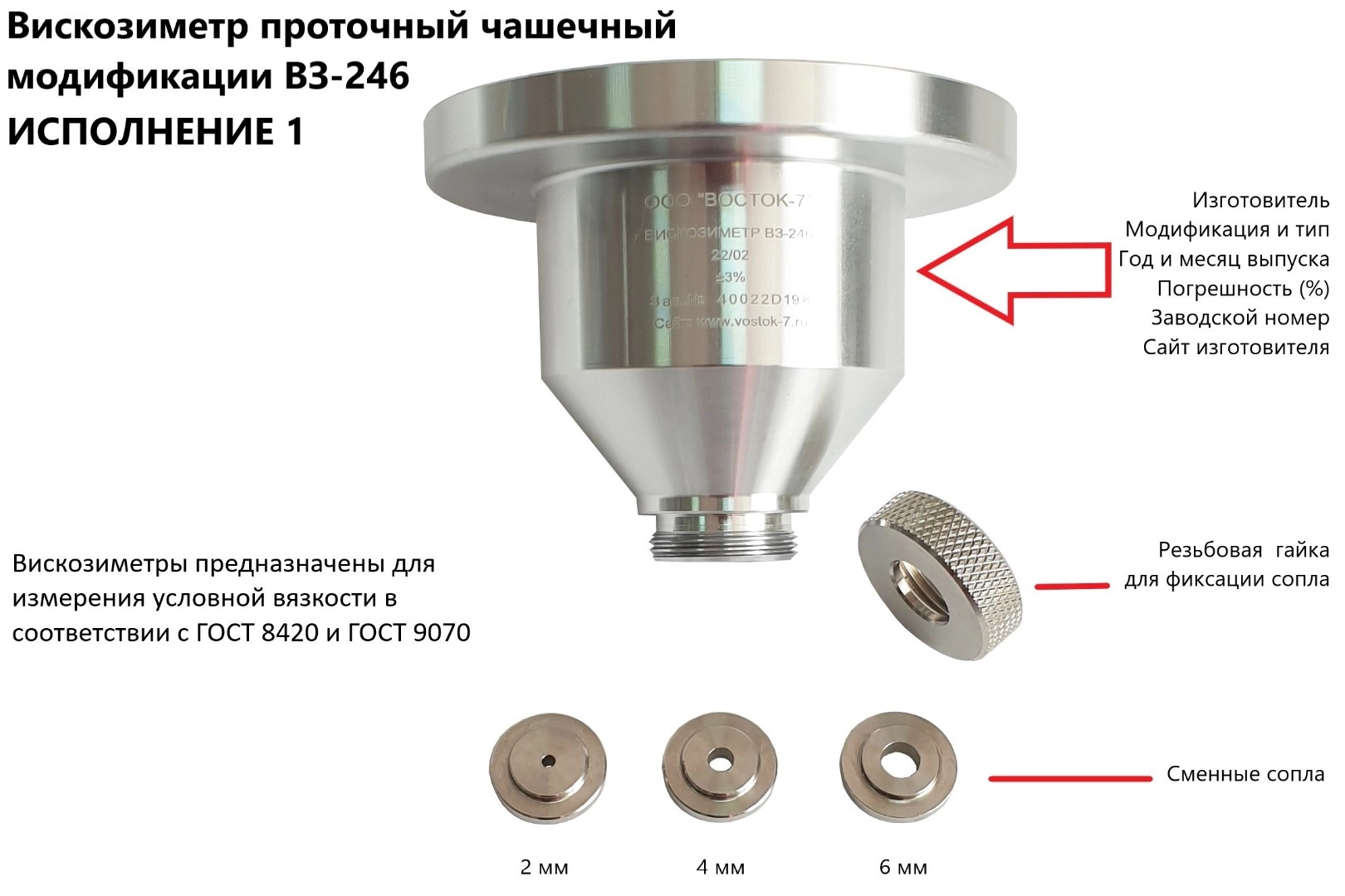 Вискозиметры предназначены для измерений условной вязкости в соответствии с ГОСТ 8420-22 (ISO 2431: 2019 NEQ). Обозначение модификации на изделии и при заказе: ВЗ-246.